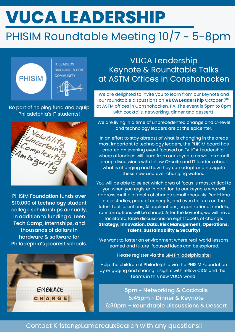 Join SIM Philadelphia and the PHISIM Foundation for an engaging evening featuring a keynote on leading through volatility, uncertainty, complexity, and ambiguity with Jen Charters, CIO of Lincoln Financial, and then followed by roundtable discussions on Talent, Innovation, Connectivity, Data, Security and more!