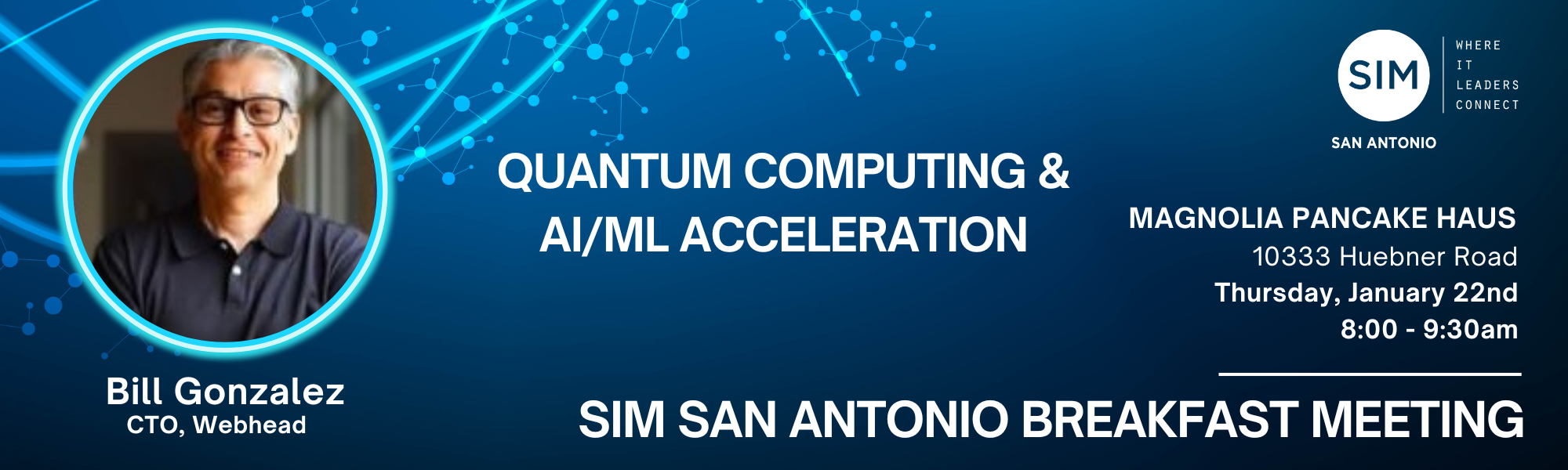 SIM San Antonio Networking BreakfastDon't miss this opportunity to connect, network, and enjoy a great meal with fellow members! Bill Gonzalez, CTO of Webhead, will be joining us in a discussion on the latest developments in the areas of Quantum Computing & AI/ML. Looking forward to seeing you there! Please note: The event is reserved for SIM Members and other Practitioner CIOs, CTOs, CISOs, and Technology Leaders. Registrations are subject to approval. You will receive notification of registration approval. Thank you.